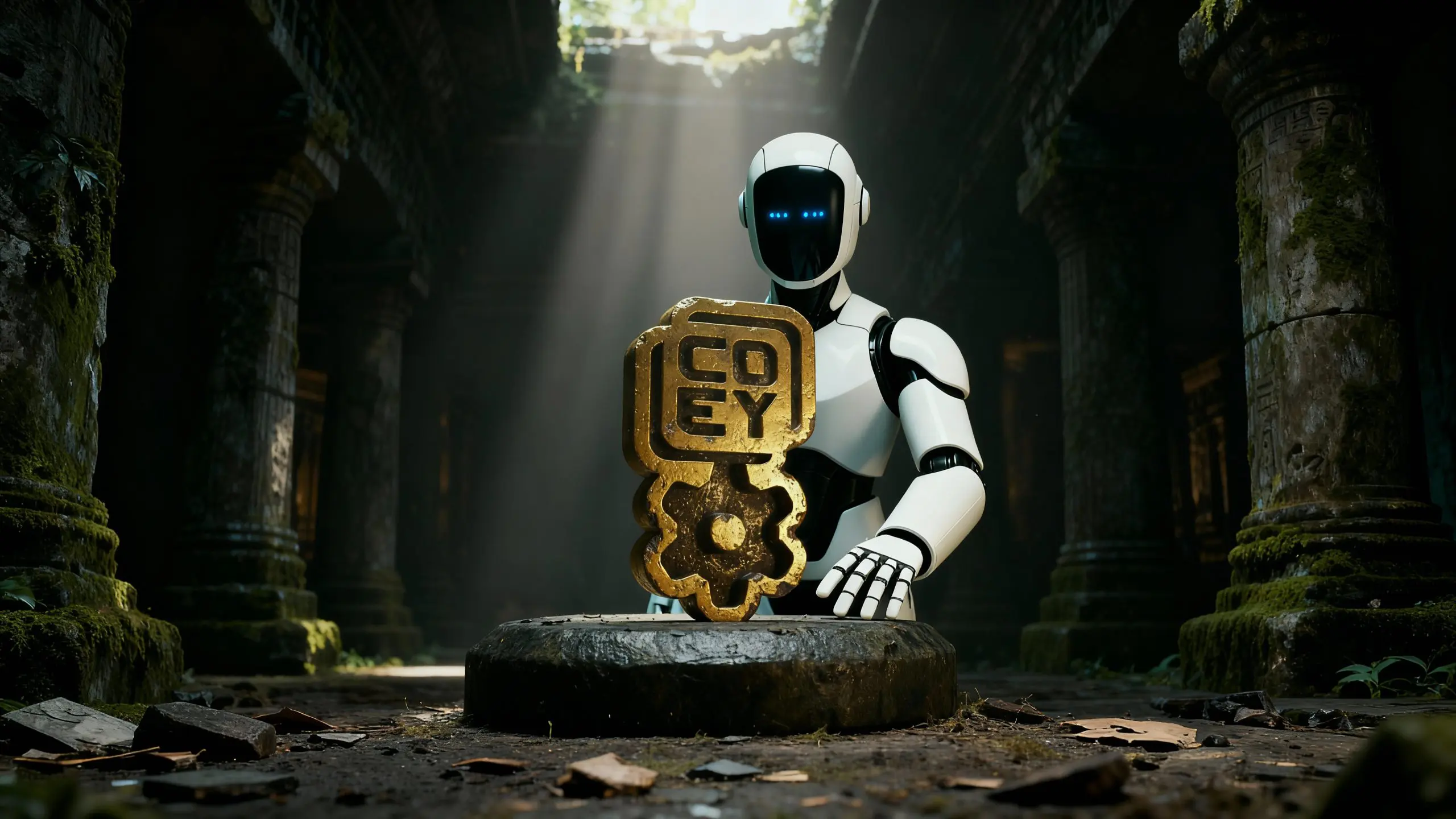 The robot picks up the gold object in his hands taking it off the pedestal. The handheld camera shakes, the room glows red, and begins to fill with water. The camera zooms into the robots face.